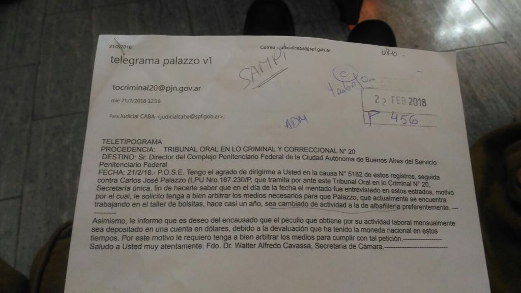 El Tribunal Criminal 20 en el marco de la causa Nº 5182 solicito al Servicio Penitenciario Federal, considere el pedido del procesado,  en cuanto a la apertura de una cuenta sueldo en dolares, debido a la devaluación de la moneda local.