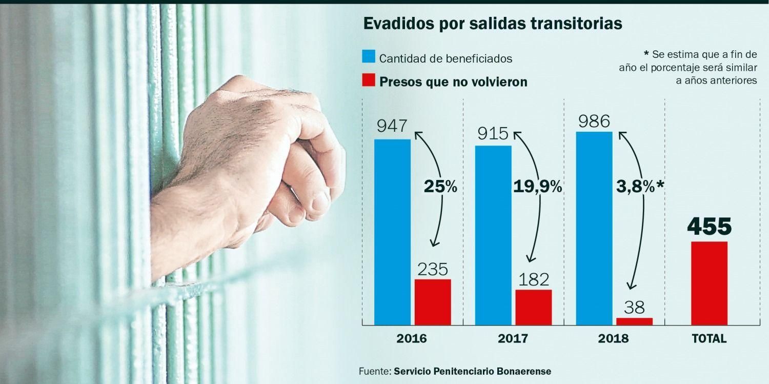 En 2017, los que nunca volvieron fueron 182 de un total de 915 reclusos con salidas transitorias durante ese año. Representó casi el 20% del total. Y en lo que va de 2018 contabilizan 38 casos, apenas un 3,8 % de las 986 personas condenadas a las que se les otorgó el beneficio. Claro que faltan 9 meses para terminar el año. En total, la secuencia arroja 455 evadidos en dos años y casi tres meses..