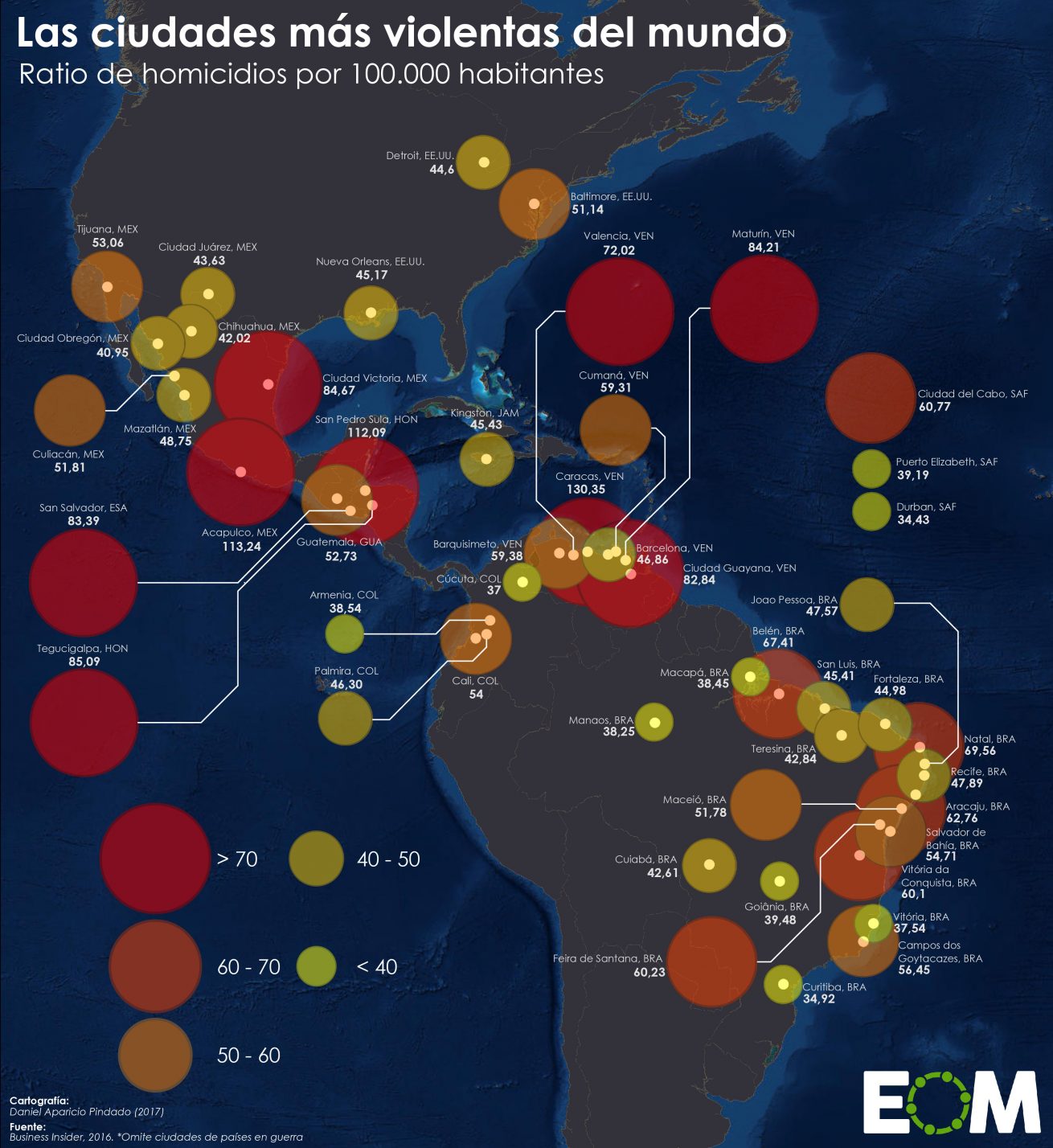 El continente americano tiene un serio problema con la criminalidad, con todo lo que ella conlleva y todo por lo que viene provocada. Ciudades mexicanas, de repúblicas centroamericanas o venezolanas tienen el dudoso honor de ser las que copan el mayor ratio de homicidios en base a su población. Sin embargo, no son una excepción, sino la punta de un iceberg que es mucho más ancho en otras ciudades del continente. En Brasil, México, Colombia o Estados Unidos, el número de urbes con un número sustancialmente preocupante de homicidios es alto, lo que refleja la multitud de causas y consecuencias que esto tiene.