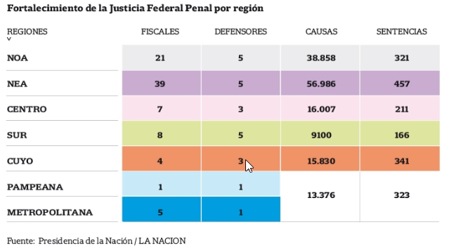 En el NOA la cantidad de jueces federales se incrementará un 121% con la llegada de 17 nuevos funcionarios. En el NEA el crecimiento será del 100% con el ingreso de 23 nuevos jueces, y en el centro el incremento será del 78%, con 14 nuevos jueces.