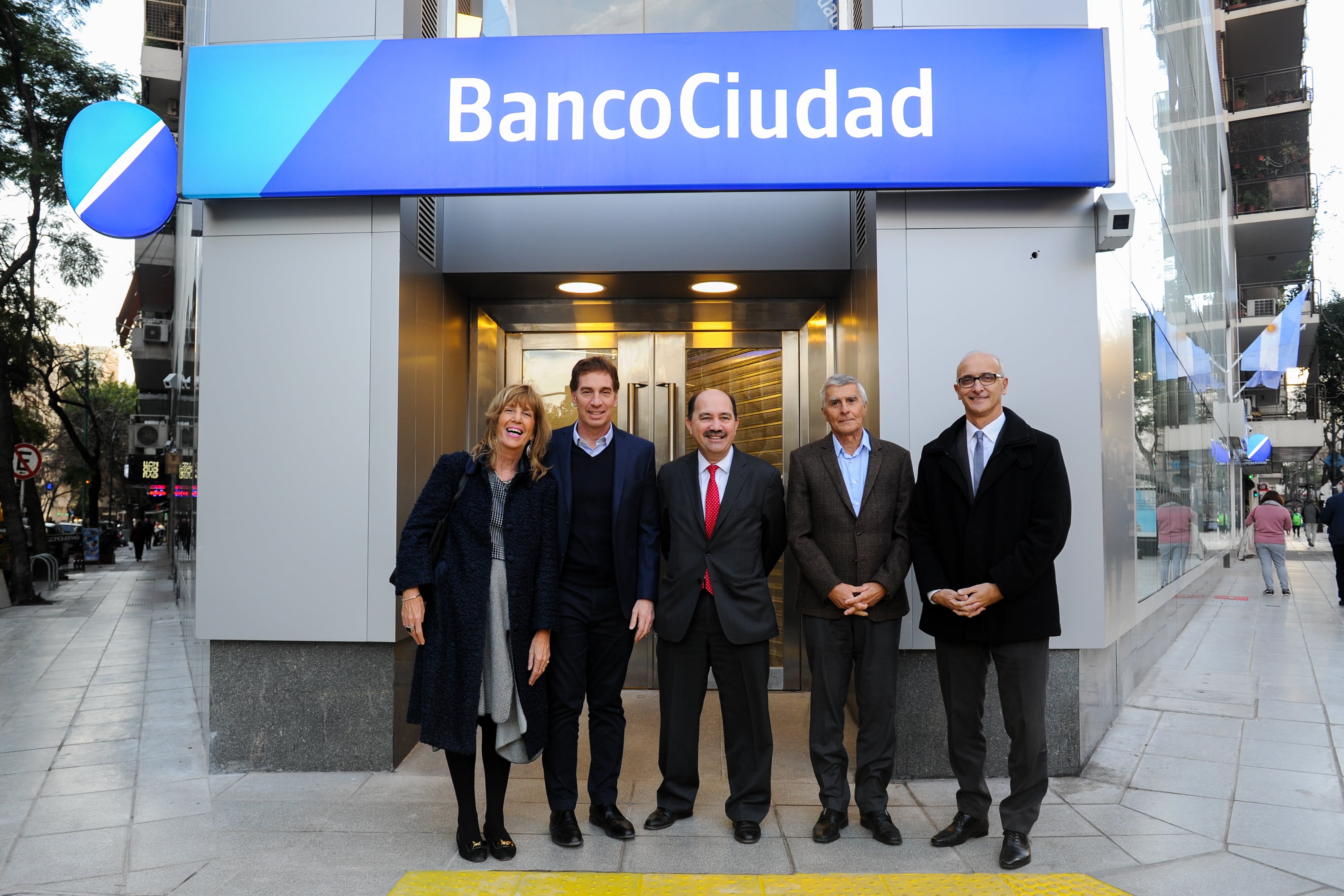 : De izq. a der., Javier Ortiz Batalla, presidente del Banco Ciudad; Alicia De Antonis, directora del Banco Ciudad; Mónica Acosta, gerente de la sucursal Las Heras del Banco Ciudad; Diego Santilli, vicejefe de gobierno de la ciudad de Buenos Aires; y Gustavo Cardoni, gerente general del Banco Ciudad.