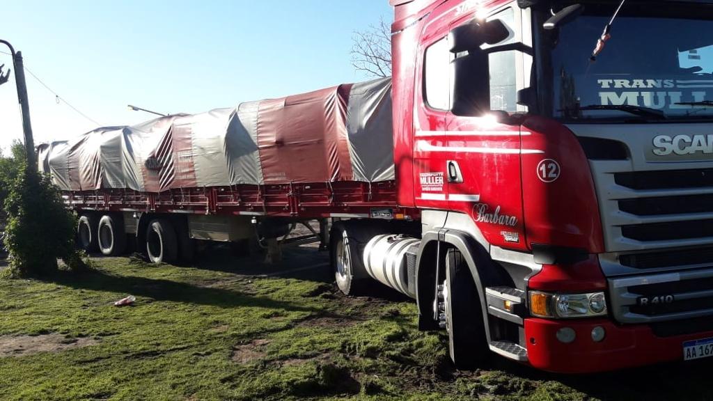 Llegados a la calle Bellomo y Vigalondo observan claras huellas de ingreso a un descampado y detendio a metros dicho camion Scania, habiendo sustraido la mercaderia que llevaba. Junto a este sobre el piso se encontraba un aparato de maletin con inhibidor de señal encendido.