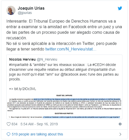 ¿Por qué lo considera interesante? «Twitter está lleno de jueces y hace tiempo que se discute si el hecho de que estén escribiendo sus opiniones políticas o jurídicas les afecta como jueces», razona Urías: «Ahí el TEDH está abriendo una vía muy interesante: la posibilidad de recusación a partir de tu vida en las redes sociales»