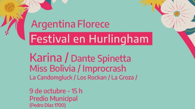 El próximo sábado 9 de octubre desde las 15 hs. se realizará en Hurlingham el festival musical “Argentina Florece”, organizado por el municipio y por el Ministerio de Cultura de la Nación, que contará con las presentaciones de la cantautora y compositora Karina, el músico Dante Spinetta y la cantante Miss Bolivia. También se presentarán la banda de percusión hurlinghense La Candomgluck, la agrupación de clown y música Los Rockan y la banda de cuarteto La Groza.