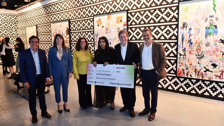 El premio a la artista visual Chola Poblete fue entregado por Guillermo A. Laje, presidente del Banco Ciudad, en el stand B20 en el que se exhibe la muestra “Pop Andino” de la artista de la Galería Pasto. Estuvieron acompañados por el vicepresidente del Ciudad, Fernando Elías; Paula Villalba, síndica de la entidad financiera; Larisa Andreani, presidenta de la Fundación arteba; y Leticia A Kabusacki y José Luis Lorenzo, del Consejo de Administración de arteba.