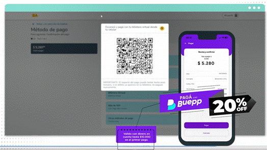 A partir de la nueva modalidad de pago con QR disponible para los trámites no tributarios de la Ciudad de Buenos Aires, la billetera digital BUEPP incorpora un original beneficio que brinda un descuento al pagar diversas gestiones en la Ciudad, tales como licencias de conducir, infracciones de tránsito, así como los trámites de Habilitaciones y del Registro Civil, entre otros. Ahora, pagando a través de Buepp, escaneando el QR del trámite seleccionado, se obtiene un descuento del 20%, con un tope de reintegro de $10.000 (por única vez, por cliente, vigente hasta el 31/12/2025).