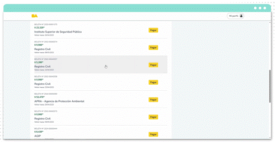 - Elegir la boleta a pagar, pulsando sobre el botón a la derecha de la misma denominado “Pagar”.